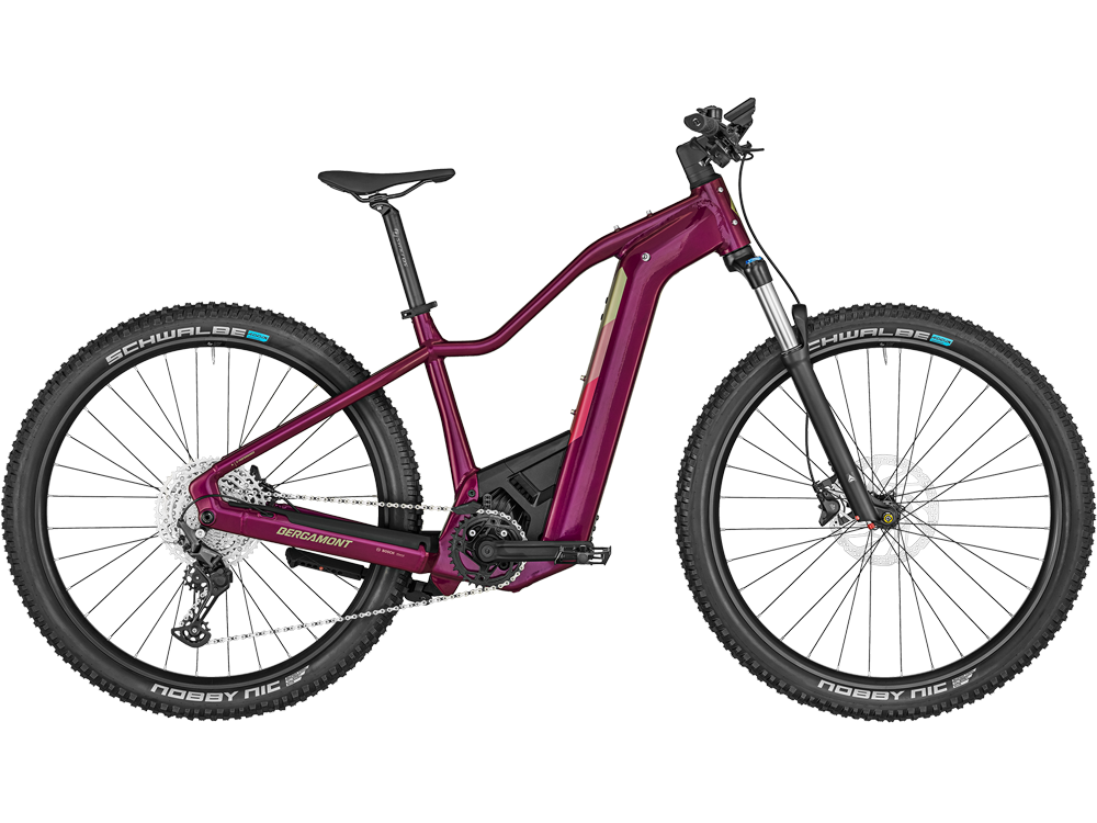 Bergamont E-Revox Pro FMN MTB E-Bike (29″ | 750Wh | maulbeerrot)Ansprechendes E-MTB-Hardtail, basierend auf einer modernen Rahmenplattform mit mit Frauen spezifischem Design und maximaler Integration der neuesten Bosch Performance Line CX Drive Unit und 750-Wh-PowerTube-Akkutechnologie.29″, super lite AL-6061 Rohrsatz, BES III, PowerTube AkkuSuntour XCR 34, 120 mm, SteckachseShimano Deore, 1x11Bosch BES3 Performance Line CX, 750 Wh AkkuShimano BR-MT410, hydraulische ScheibenbremseCross X18 Felgen, Shimano MT400 NabenSchwalbe Nobby Nic Evo, 29×2.60″
