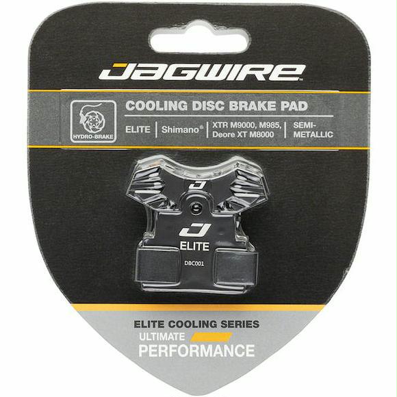 Jagwire Elite Cooling Pads verwenden leichte Aluminium-Kühlrippen, die in die Trägerplatte integriert sind, um Wärme vom Bremssystem abzuleiten. Eine Wärmeübertragungsplatte aus Graphen leitet Wärme von der halbmetallischen Verbindung und dem Rotor in die