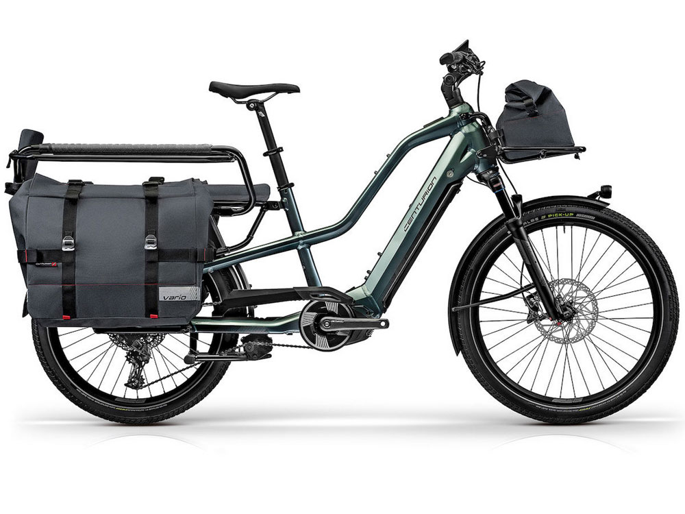 Centurion Vario R960i EP1 E-LastenfahrradMit dem Vario präsentieren wir unser ersten Cargobike. Es verbindet gekonnt maximale Variabilität und vielfältigste Transportmöglichkeiten mit sicheren Fahreigenschaften und einem natürlichen Fahrgefühl. Auf dem äußerst robusten und langen Heckträger können, dank der vielfältigen Befestigungs- und Anpassungsmöglichkeiten, Personen oder Lasten mit bis zu 70 kg komfortabel transportiert werden. Ein Frontgepäckträger macht die beachtlichen Transporteigenschaften komplett. Ob mit zwei Kindersitzen, einer handelsüblichen Eurobox oder den in Kooperation mit Vaude entwickelten und im Lieferumfang enthaltenen Transporttaschen ausgestattet: Das Vario ist im Handumdrehen an die aktuellen Bedürfnisse angepasst und deckt eine unglaubliche Bandbreite an unterschiedlichsten Anforderungen ab. Damit sind Sie für sämtliche Freizeitaktivitäten und alle Aufgaben des Alltags bestens gerüstet.Durch die Verwendung unterschiedlicher Laufradgrößen (26“ am Vorderrad / 24“ am Heck) erzielen wir einerseits genügend Platz für den großen Heckgepäckträger und schaffen andererseits ein komfortables Überrollverhalten. Vorteilhaft an dieser Wahl ist, dass unser Vario mit einer Gesamtlänge von zwei Metern nur unwesentlich länger ist als ein herkömmliches Pedelec. Die benötigte Abstellfläche bleibt daher klein. Die tiefe Platzierung des Heckgepäckträgers sorgt für einen optimalen Schwerpunkt. In Kombination mit den großen Rohrquerschnitten, die für beste Rahmensteifigkeit sorgen, erzielen wir stets sichere Fahreigenschaften und ein natürliches Fahrgefühl. Mit einem maximal zugelassenen Gesamtgewicht von 180 kg ist das Vario für vielfältige Transportaufträge gerüstet. Der robuste, langgezogene Heckgepäckträger kann bis zu 70 kg aufnehmen und ist mit zwei Schnittstellen für Kindersitze der Marke Thule Yepp EasyFit sowie diversen Befestigungsmöglichkeiten ausgestattet. Der zusätzliche Frontgepäckträger, der zwei Schnittstellen für Flaschenhalter integriert sowie die Anbringung eines Expanders ermöglicht, kann mit bis zu 15 kg belastet werden. Dank seiner unglaublichen Variabilität ist das Vario für verschiedenste Aufgaben im Personentransport bestens gerüstet. Ist der Transportbügel montiert, können bis zu zwei Thule Yepp Maxi EasyFit Kindersitze (Abb. 1) schnell und einfach am Heckträger befestigt werden und Kinder im Alter von einem bis mindestens vier Jahren sicher transportiert werden. Für bis zu zwei Kinder ab einem Alter von fünf Jahren eignet sich unser Passagier-Kit (Abb. 2) am besten. Es beinhaltet einen Transportbügel, eine gepolsterte Sitzbank inklusive Rückenkissen sowie Trittbretter und einen Speichenschutz für optimale Sicherheit. Die Mitnahme auf der Sitzbank mit Haltegriff (Abb. 3) ist für ein größeres Kind sowie einen jungen Erwachsenen ab elf Jahre und bis maximal 70 kg zugelassen – unsere dritte Option für den Personentransport. Auch hier bietet unser Speichenschutz erstklassige Sicherheit.