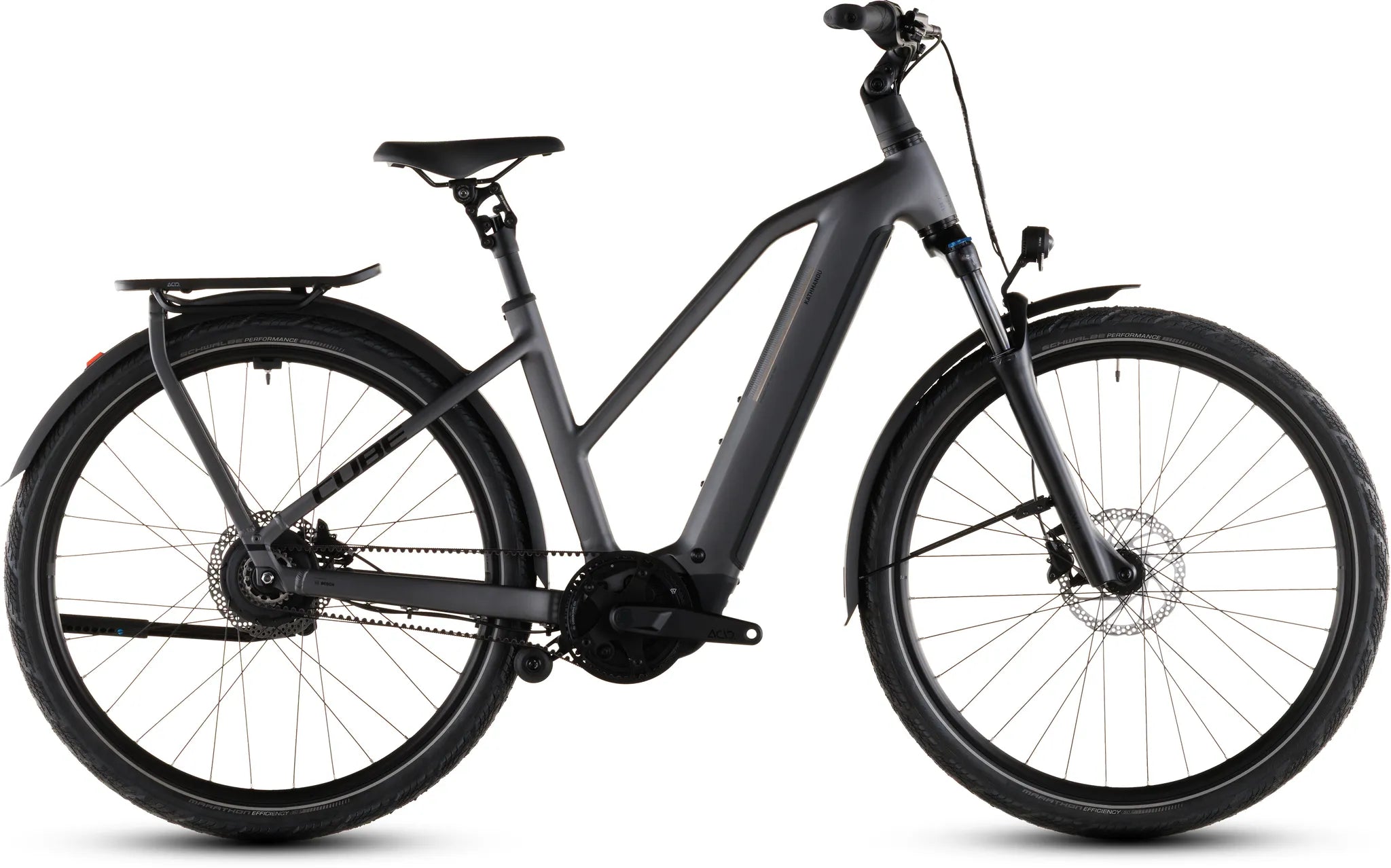 Cube Kathmandu Hybrid Comfort Pro 800 slabgrey´n´black Trapeze 2026Die cleane Linienführung des CUBE Kathmandu Hybrid Comfort Pro mag täuschen, denn dieser elegante Tourer hat ein paar unschlagbare technische Asse im Ärmel. Zum Beispiel eine stufenlos verstellbare Enviolo Nabenschaltung – also einfach drehen, bis der perfekte Gang drin ist – und einen Zahnriemen statt einer (öligen) Kette. Sein Bosch CX Antrieb stellt bis zu 90 Nm Drehmoment zur Verfügung, das bedeutet effiziente Unterstützung für kraftsparendes Pedalieren auf allen Routen und Anstiegen. Für die entsprechende Reichweite sorgt der 800 Wh starke PowerTube Akku und weil so viel Vortrieb auch top kontrolliert werden will, haben wir kraftvolle hydraulische Scheibenbremsen von Shimano verbaut, die das Bike selbst bei Nässe zuverlässig verzögern. Was noch? Eine Suntour Luftfedergabel, einen verstellbaren Vorbau, eine Parallelogramm-Sattelstütze, unseren integrierten Gepäckträger IC 3.0 und eine Zubehör-Vollausstattung. Auf das Bike, fertig, los!