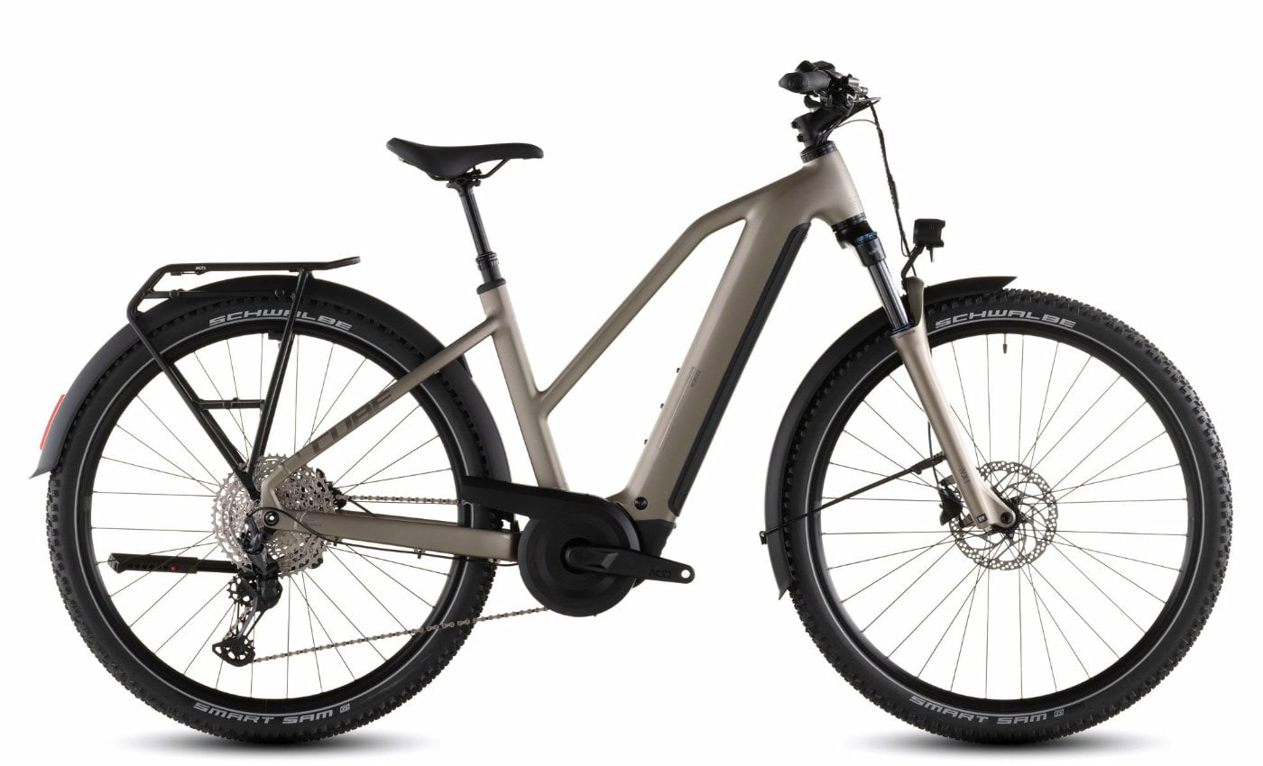 Cube Nuride Hybrid Pro 800 Trapez – flashstone´n´chrome Das Cube Nuride Hybrid Pro 800 Trapez in flashstone´n´chrome vereint die Vielseitigkeit eines Mountainbikes mit dem komfortablen Einstieg eines Trapezrahmens. Sein kraftvoller Bosch Performance Line CX Motor mit bis zu 100 Nm Drehmoment und der elegant integrierte 800 Wh PowerTube Akku liefern jede Menge Power und Reichweite für tägliche Fahrten und lange Touren. Mit dem semi-integrierten SIC 2.0 Gepäckträger, Schutzblechen, Lichtanlage und Seitenständer bringt das Rad alles mit, was du für Stadt und Gelände brauchst. Die breit gefächerte Shimano XT 12-fach Schaltung sorgt für geschmeidige Gangwechsel, während die hydraulischen Shimano Scheibenbremsen jederzeit verlässlich verzögern. Extra Komfort liefert die Suntour NX1-32 Luftfedergabel mit 100 mm Federweg sowie die robusten Schwalbe Smart Sam Reifen, die auch auf unebenem Untergrund sicheren Grip garantieren. Abgerundet wird das Set-up durch eine Dropper Post für variable Sitzpositionen. Kurz: ein vielseitiges, leistungsstarkes und voll ausgestattetes E-Bike für jedes Abenteuer. Rahmen: Aluminium Superlite, Fully Integrated Battery, SIC 2.0, Boost148 Rahmentyp: Trapez Motor: Bosch Performance Line CX, bis 100 Nm Akku: Bosch PowerTube 800 Wh Display: Bosch Purion 200 Schaltung: Shimano XT 12-fach Bremsen: Shimano BR-MT200, hydraulische Scheibenbremsen Federgabel: SR Suntour NX1-32 Air, 100 mm Laufräder: ACID SLX 25, Tubeless Ready Reifen: Schwalbe Smart Sam, 57 mm Sattelstütze: CUBE Dropper Post, absenkbar Gepäckträger: ACID SIC 2.0 semi-integriert Ausstattung: Lichtanlage, Schutzbleche, Ständer, Glocke, Schloss Gewicht: ca. 26,8 kg Farbe: flashstone´n´chrome Max. Systemgewicht: 140 kg Das Cube Nuride Hybrid Pro 800 Trapez flashstone´n´chrome ist ein komfortables, starkes und rundum ausgestattetes E-Bike – perfekt für Alltag, Touren und Abenteuer abseits der Straße.