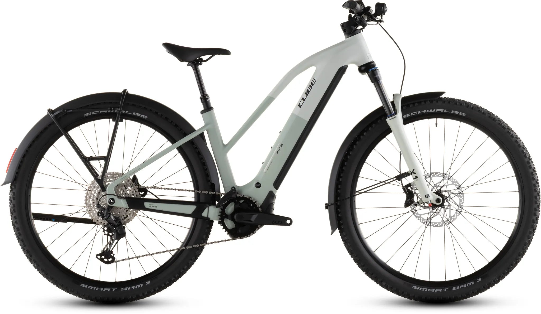 Cube Reaction Hybrid Pro 800 FE desertstone´n´driedherbs Trapeze 2026Das Beste aus zwei Welten: Das Reaction Hybrid Pro FE kombiniert die Vielseitigkeit eines voll ausgestatteten Tourers mit der Robustheit eines Mountainbikes und dem Support durch einen E-Motor. Dabei hat das Bike neben Schutzblechen, Gepäckträger, Seitenständer und Lichtern noch weitere Highlights auf Lager. Dank dem leistungsstarken Bosch CX Motor und 800 Wh starken Akku sind jede Menge Power und Reichweite garantiert, und zwar auf jeder Route, ob über Asphalt oder im Gelände. Dabei macht die einfach bedienbare Shimano XT 12-fach Schaltung selbst steile Anstiege zum Kinderspiel. Bergab packen die hydraulischen 4-Kolben-Scheibenbremsen von Shimano kraftvoll zu und verzögern die griffigen Schwalbe 2.6 Zoll Reifen zuverlässig und sicher. Für eine Extraportion Fahrkomfort und Kontrolle auf ruppigeren Strecken haben wir eine Luftfedergabel mit 120 mm Federweg (100 mm bei kleinen RahmenGrößen und allen Tiefeinsteiger-Modellen) und eine versenkbare Sattelstütze verbaut.