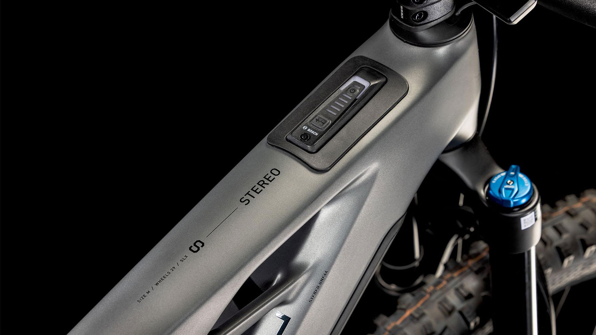 Das Bosch E-Bike System setzt sich aus dem stärksten Bosch Motor, dem CX, dem riesigen 800 Wh Akku und, in dieser SLX-Version, dem kompakten Bosch Purion 400 Farb-Display, samt Mini remote am Oberrohr zusammen., Hier bekommst du das klasse ausgerüstete Cube Stereo Hybrid ONE44 HPC SLX mit Fox Fahrwerk und Shimano XT Vollausstattung., Feine Schaltvorgänge verspricht hier die Ausrüstung mit einer Shimano 12-Gang Schaltung., Die Fox 36 Float Rhythm Federgabel übernimmt mit 150 mm Federweg die Federung an der Front., Ansonsten zeigt sich das Cube Stereo Hybrid ONE44 HPC SLX als klassisches 29er E-Fully., Die Cube Stereo Hybrid HPC Modelle präsentieren sich als sportive All-Mountain-E-Fullys mit Carbonrahmen, Aluminium-Hinterbau und liegendem Dämpfer., Zusammen mit den 203 mm Rotoren der Shimano XT Scheibenbremse behältst du auf schnellen Trails volle Kontrolle., Sportlicher Fahrspaß auf jedem Trail: Das klasse ausgerüstete Stereo Hybrid