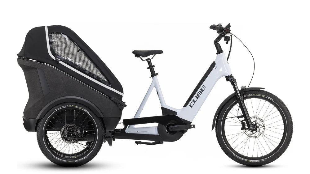 Cube Trike Family Hybrid 750 flashwhite´n´reflex 2026Hier ist es, das CUBE E-Bike, das ein Auto ersetzen kann. Das Trike Family Hybrid 750 bringt Sicherheit, Komfort und unkompliziertes Handling auf einen Nenner. Wie? Mit seinem innovativen Design und Bosch CX Line Antrieb der vierten Generation samt 750 Wh starkem Akku. An der Front dämpft die Suntour Mobie34 Cargo Federgabel Ruckler von Schlaglöchern geschmeidig ab und sorgt so für ein angenehmes Fahrgefühl. Um den wohldosierten Vortrieb kümmert sich die einfach zu bedienende, stufenlose Nabenschaltung. Gebremst wird mit den leistungsstarken Scheibenbremsen – on top gibt’s eine Feststellbremse zum sicheren Abstellen. Weil wir das Bike mit einer Teleskop-Sattelstütze und einem in Winkel und Höhe verstellbaren Vorbau ausgestattet haben, lässt es sich schnell und einfach auf fast jede KörperGröße anpassen. In der vielseitigen Cargobox am Heck gibt’s eine herausnehmbare Kindersitzbank mit Sicherheitsgurten und Regenverdeck für den sicheren und entspannten Transport der Kids, Einkäufe und so weiter. Zudem ermöglicht eine einzigartige Neigetechnik zusammen mit der stabilen dreirädrigen Konstruktion so einfaches Manövrieren wie mit einem klassischen E-Bike. Könnte also den Zweitwagen ablösen, oder?