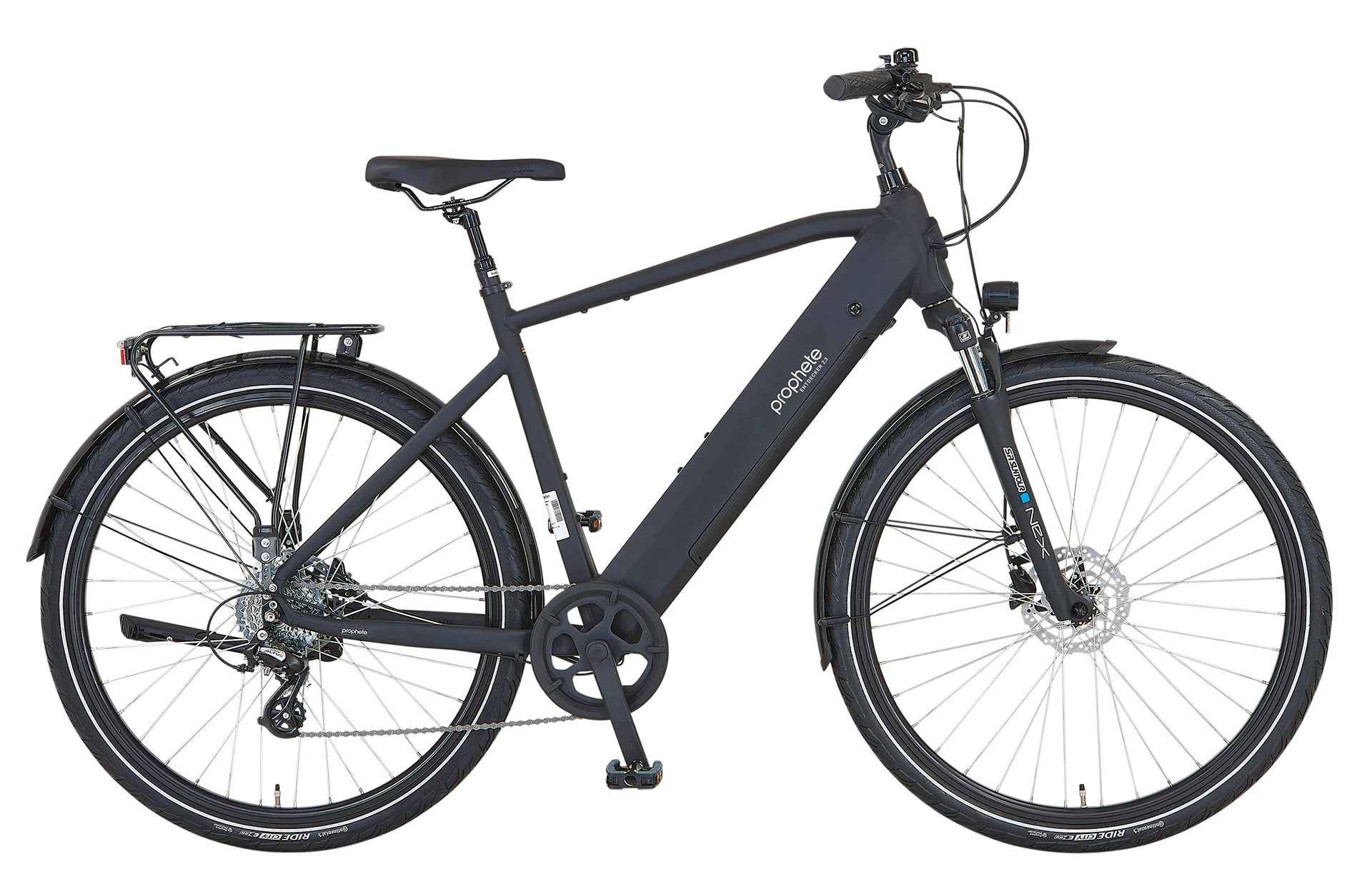 Der Einstieg in die Welt des Trekkings mit dem Prophete Entdecker 2.3 E-Bike. Trotz des attraktiven Preises wurde hier nicht an Funktionalität gespart. Die gehobene Einstiegsklasse gönnt sich das gewisse „Extra“ für die Trekking Tour am Wochenende. Mit einem 36 Volt Heckmotor von enovation bringt das E-Bike 250 Watt Leistung bei einem maximalen Drehmoment von 40 Nm auf die Strecke. Die Energie für den Motor und die anderen elektronischen Bauteile liefert ein 10 Ah (360 Wh) Lithium-Ionen-Akku, der vollständig im Rahmen integriert wurde. Bis zu 100 km Reichweite sind je nach Fahrweise und Untergrund möglich. Dank des CAN-Bus Systems kommuniziert die Elektronik in Echtzeit und liefert aktuelle Daten an das LCD-Multifunktionsdisplay 2.0.
