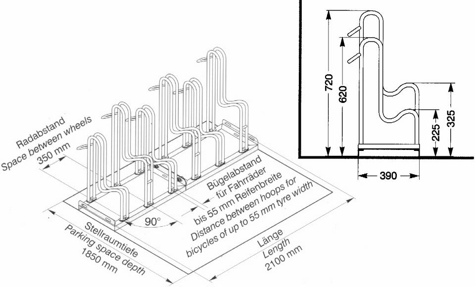 Standsicherheit fürs Fahrrad. Schonend für Reifen und Felge. Platzsparendes Parken der Fahrräder durch abwechselnde Tief-/Hocheinstellung.