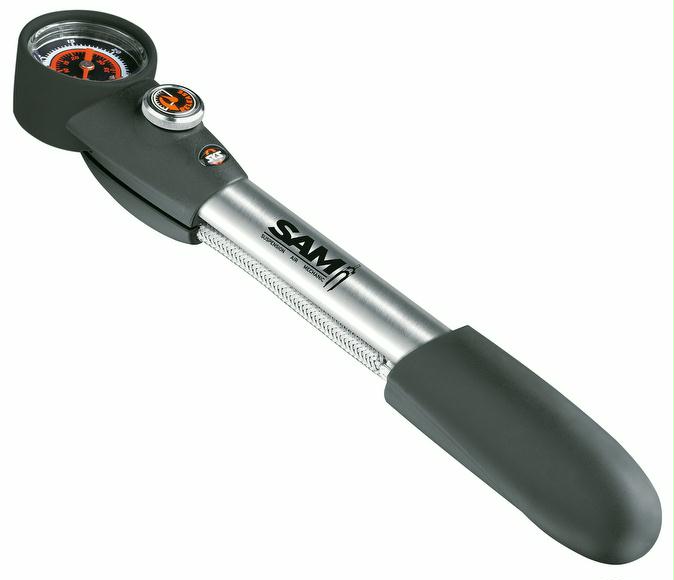 Die SKS-Dämpferpumpe SAM (steht für Suspension Air Mechanic) ist durch das Design einer Minipumpe voll tourentauglich. Der schwenkbare Schlauchanschluss ist mit Stahlflex-Gewebe armiert, was bei einem Maximaldruck von über 22 bar durchaus Sinn macht.