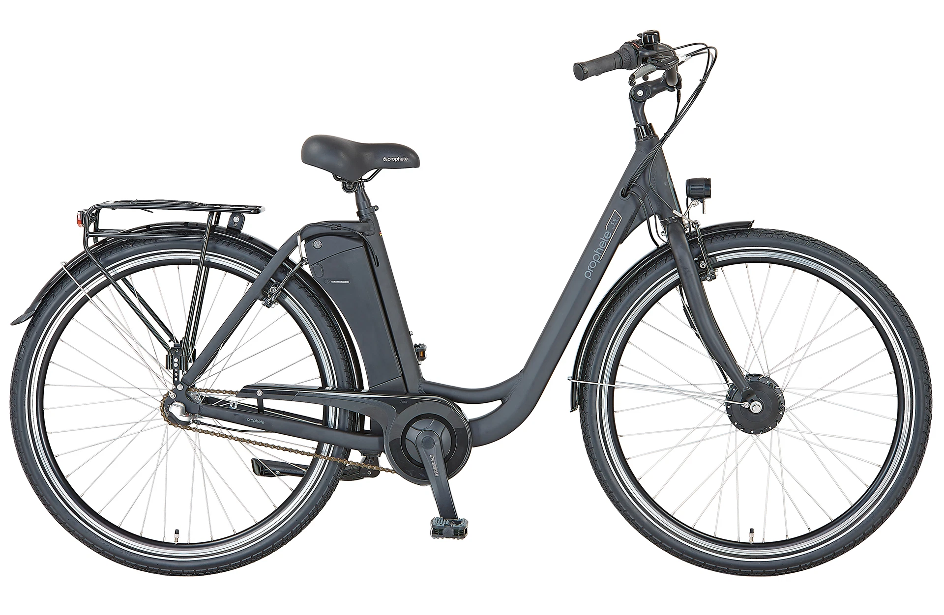 Mit dem Prophete Geniesser 1.0 City E-Bike fährst du entspannt durch die Stadt oder auf einen kleinen Wochenendausflug. Das Einsteigermodell mit 28“ Bereifung ist der perfekte Start in die Welt der E-Bikes und hat ganz nebenbei auch so einiges zu bieten. Der 36 Volt Frontmotor mit einer Leistung von 250 Watt und einem maximalen Drehmoment von 40 Nm hat es z.B. in sich. Viele E-Biker*innen berichten, dass sich die Fahrt anfühlt, als würde man „gezogen“ werden. Die Energie für diese Leistung bekommt der Motor aus dem Lithium-Ionen SideClick Akku mit 10,4 Ah (374 Wh), der unterhalb des Prophete Citysattels am Sitzrohr montiert wurde, was für einen optimal positionierten Schwerpunkt deines E-Bikes sorgt.