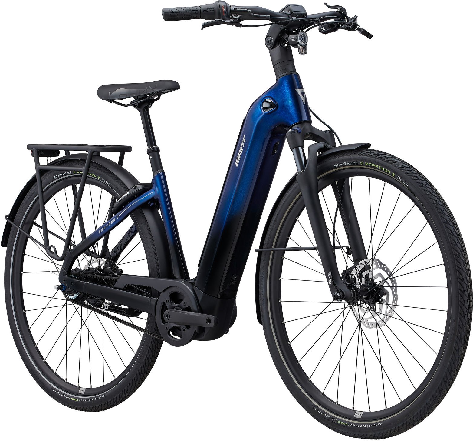 Auf unebenem Untergrund sitzt du sicher und gelassen: Die SR Suntour NEX E25 NLO Federgabel mit 63 mm Federweg schluckt Stöße, die breite 50 mm Reifen der Schwalbe Marathon E Plus bieten verlässlichen Grip und Pannenschutz, und die Giant eX2-F…