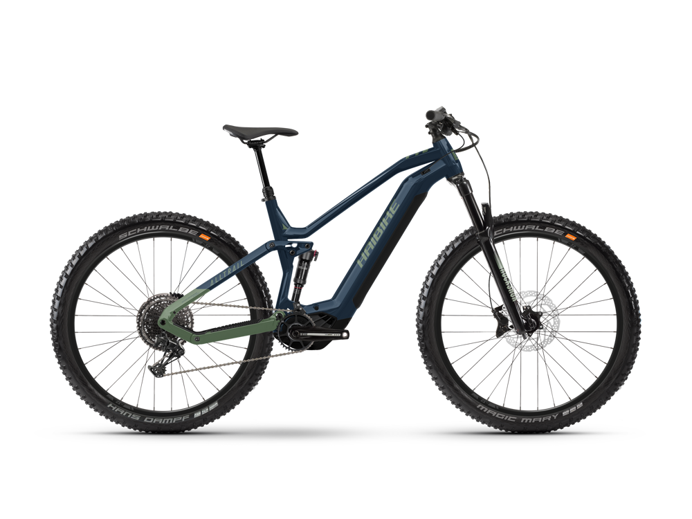 Haibike AllTrail 9 Fully MTB E-Bike (29″ | 720Wh | blau / olive)Du suchst ein eFully, mit dem du es richtig krachen lassen kannst? Ohne dabei Kompromisse in Sachen Sicherheit und Komfort machen zu müssen? Dann wirst du mit unserem ALLTRAIL 9 29 jede Menge Spaß auf den Trails haben! Mit dem kompakten und leistungsstarken Yamaha PW-X3 Motor mit 85 Nm Drehmoment und 720 Wh Akku nimmst du entspannt jeden Anstieg und kannst deine Reichweite mit dem optionalen Range Extender sogar um zusätzliche 360 Wh steigern. Hochwertige Komponenten wie die SRAM NX Eagle Schaltung, Shimano 4-Kolben Scheibenbremsen sowie RockShox Federelemente mit 140 mm Federweg vorne und hinten sorgen dafür, dass du dein eMTB immer voll im Griff hast und dich voll und ganz dem Flow hingeben kannst.Wir wollen nicht einfach von A nach B kommen, sondern diese Zeit mit einzigartigen Erfahrungen füllen und das Beste aus uns herausholen. Egal ob wir am Flussufer entlang, hinauf in die Weinberge oder zum Stadtbummel aufbrechen. Es ist immer ein erhebendes Gefühl, das uns vorantreibt. Was wir auf unseren Wegen finden, sind Momente von Euphorie, grenzenlose Freiheit und ein Gespür von Vollkommenheit. Mit einem Lächeln auf den Lippen, Sonnenwärme auf der Haut und einem Begleiter, der uns stets Rückenwind gibt: Unsere E-Bikes erweitern den Aktionsradius und lassen uns mehr von der Welt sehen.
