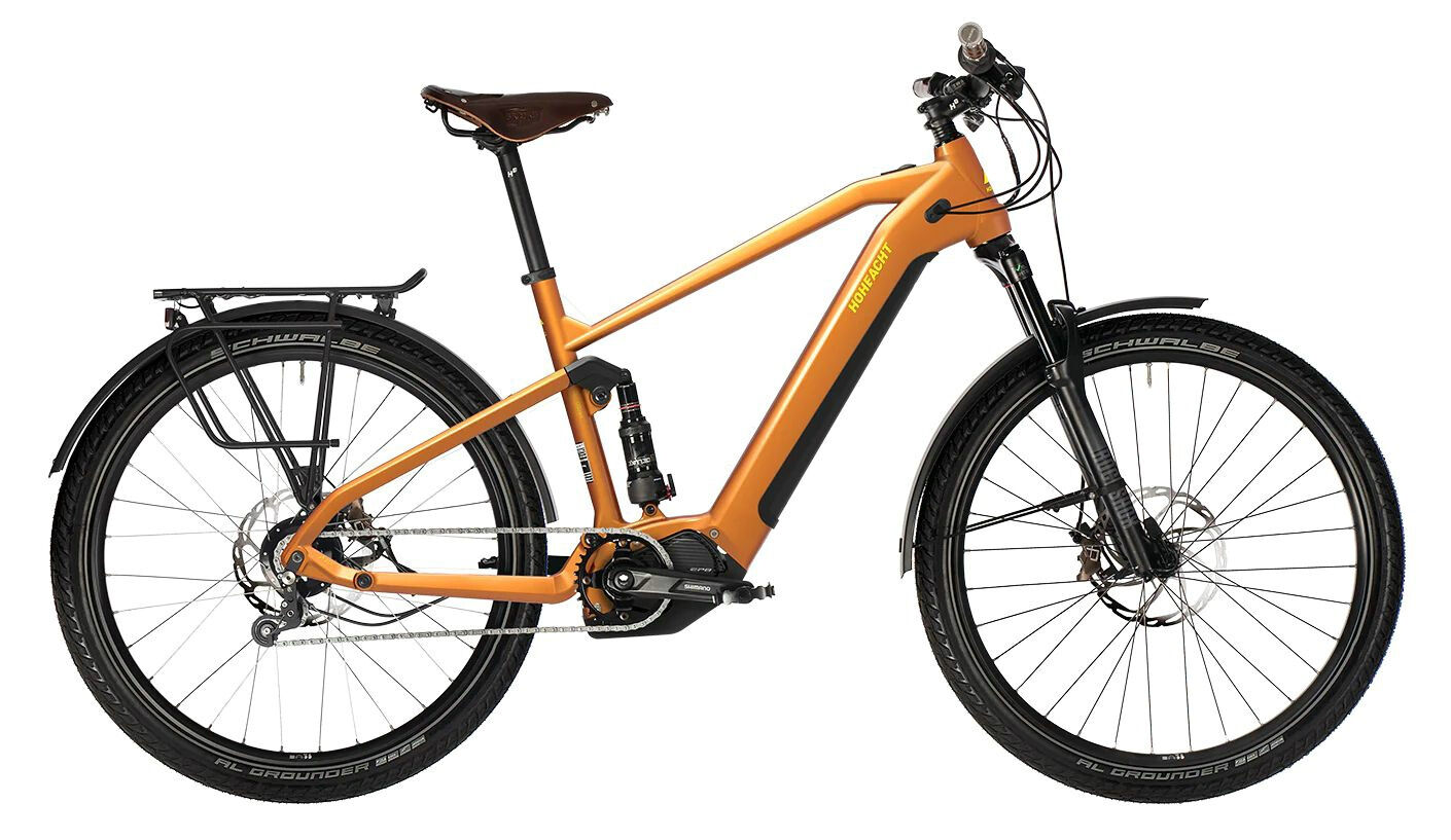 Versandkosten: 2 | Laufradgröße hinten: 27,5 | Motorleistung (Nm): 85 | Rahmenform: Diamant | Rahmenmaterial: Aluminium | Bremsscheibe hinten (mm): 180 | Bremssystem: Scheibenbremse | Laufradgröße vorne : 27,5 | Motorposition: Mittelmotor | Federung: luftgefedert | Akkuposition: intube | Gabelhersteller: RockShox | Bremsscheibe vorne (mm): 203 | Rahmengröße: L | Motorhersteller: Shimano | Akku-Kapazität (Wh): 630 | Rücktritt/Freilauf: Freilauf | Schaltungstyp: Nabenschaltung | Federweg (mm): 120 | Maximales Gesamtgewicht (kg): 150 | Akku: Shimano Steps, BT-E8036, 630 Wh, integriert | Speichen: Mach1, Edelstahl, 2,0 mm, schwarz | Schutzbleche: SKS, PET Radschutz, A69R, 28 Zoll | Gepäckträger: AtranVelo, Tour 365 BS H-Cargo, 27 kg Zuladung | Rückleuchte: Herrmans, H-Cargo E-Bike 6-12 V, 4 LEDs, 0.6 W, integriert, Standlicht, BR-12 Reflektor | Motor: Shimano Steps, DU-EP8, 25 km/h, 85 Nm, Mittelmotor | Felgen: Mach1, Trucky 30, 27,5“, Aluminium, schwarz | Gewicht ca. (kg): 24.9 | Farbe: Orange | Kassette: Rohloff, 16 Zähne | Reifen: Schwalbe, Al Grounder, 27.5“ x 2.35“ (60-584), Reflex | Kurbelsatz: Kettenblatt Shimano Steps, SM-CRE80, 34 Zähne, Stahl/Aluminium Kurbelarmset Shimano Steps, FC-EM600, 170 mm | Gabel: Federgabel, RockShox, 35 Silver TK | Schaltungshersteller: Rohloff | Bremshebel: Hayes, Dominion A4 | Bremse: Hayes, VR Dominion A4, Vierkolben, HR Dominion A4, Vierkolben, hydraulische Scheibenbremse | Hersteller-Farbe: Herbstlicht | Naben hinten: Rohloff, SPEEDHUB 500/14 A12, 15 x 148 mm, Boost | Steuersatz: ACROS, zs44, zs56, industriegelagert, Stem Cap SP-Connect | Kette: Kette KMC, e1 EPT | Sattel: Brooks, B17 | Naben vorne: Formula, DC-711, Disc, 15 x 110 mm, industriegelagert, Boost | Ganganzahl: 14 | Vorbau: Kalloy – HoheAcht, 40 mm, 60 mm, ±7°, Aluminium, schwarz | Pedale: Marwi, SP-2160, AL-6061 Extrusion T6 | Schalthebel: Rohloff, SPEEDHUB 500/14 A12, Schaltdrehgriff, 14 Gang | Sattelstütze: Kalloy – HoheAcht, Seatpost 2D, 31,6 mm x 350 mm, 10 mm Offset, Aluminium | Dämpfer: RockShox, Deluxe Select+ | Lenker: Kalloy – HoheAcht, 31,8 mm, Breite 720 mm, Biegung 12°, Rise 15 mm, Aluminium, schwarz | Scheinwerfer: Supernova, V521S, 5-21 V, Power LED, 4.8 W, 235 lm, Aluminium | Display: Shimano Steps, SC-E7000, Bluetooth, ANT Private | Schaltung: Rohloff, SPEEDHUB 500/14, 14-Gang Nabenschaltung, Freilauf | Griffe: Brooks, Slender Leather Grips, 130 mm / 100 mm | Ständer: AtranVelo, Rex DV, KSA 18
