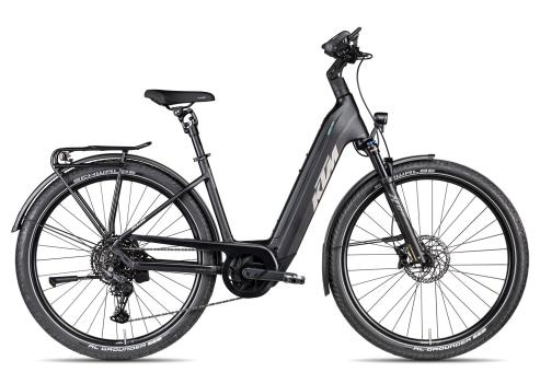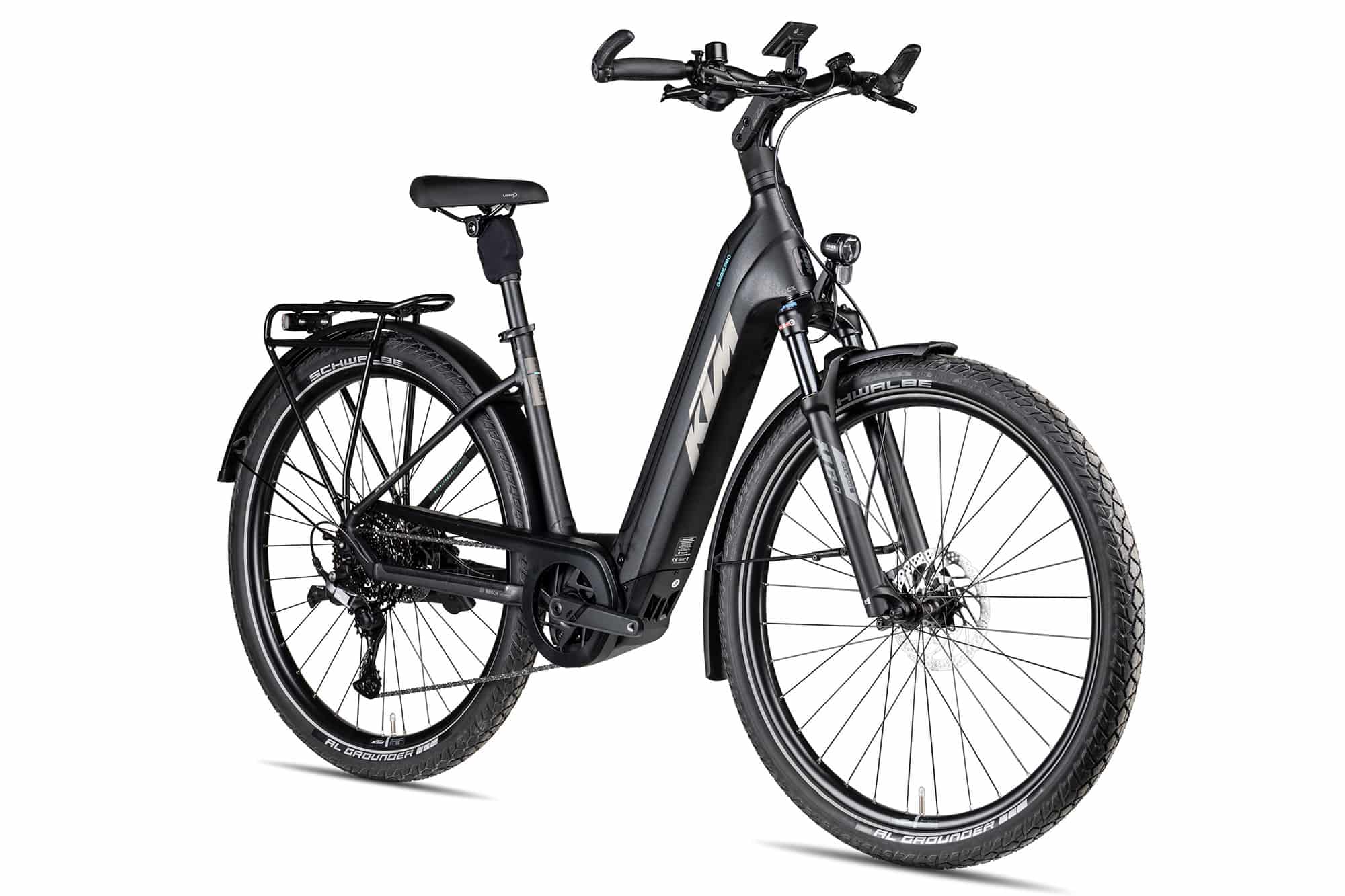 Die Kombination aus dem leistungsstarken Bosch CX Antrieb und dem größten 800 Wh Akku sorgt für eine satte Tretkraftunterstützung bis 25 km/h, die dich auch auf anspruchsvollen Touren durch jede Etappe bringt., Das smarte Intuvia 100 Display und das 4 Ampere Ladegerät komplettieren die hochwertige Bosch-Ausstattung des KTM Gran Pro., Eine Shimano Cues Schaltung mit 10 Gängen und ShadowPlus Schaltwerk sowie eine Shimano 4-Kolben Scheibenbremse garantieren gute Brems- und Schaltleistung auf all deinen Fahrten., Im Vergleich zu anderen E-Trekkingbikes hebt sich das KTM Gran Pro durch seine großen Laufräder ab., Suchst du nach einem Allround-E-Bike, das sowohl leistungsstark als auch bestens ausgestattet ist und dich auf lange Radtouren begleitet?, Die stabilen Ryde Rival Felgen und die 60 mm breiten Schwalbe Al Ground Reifen ermöglichen es dir, auch auf gröberem Untergrund sicher zu fahren., Und dank der Ergon bar-end Griffe und des 80 Lux