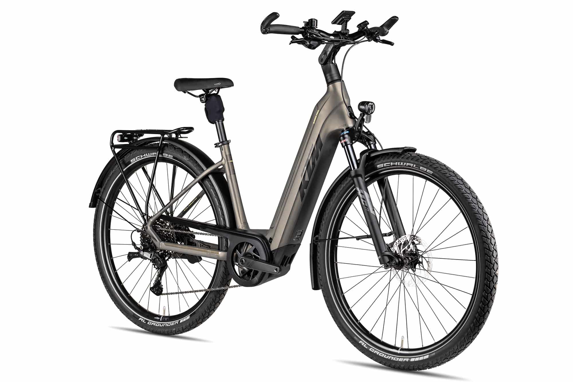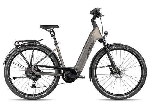 Die Kombination aus dem leistungsstarken Bosch CX Antrieb und dem größten 800 Wh Akku sorgt für eine satte Tretkraftunterstützung bis 25 km/h, die dich auch auf anspruchsvollen Touren durch jede Etappe bringt., Das smarte Intuvia 100 Display und das 4 Ampere Ladegerät komplettieren die hochwertige Bosch-Ausstattung des KTM Gran Pro., Eine Shimano Cues Schaltung mit 10 Gängen und ShadowPlus Schaltwerk sowie eine Shimano 4-Kolben Scheibenbremse garantieren gute Brems- und Schaltleistung auf all deinen Fahrten., Im Vergleich zu anderen E-Trekkingbikes hebt sich das KTM Gran Pro durch seine großen Laufräder ab., Suchst du nach einem Allround-E-Bike, das sowohl leistungsstark als auch bestens ausgestattet ist und dich auf lange Radtouren begleitet?, Die stabilen Ryde Rival Felgen und die 60 mm breiten Schwalbe Al Ground Reifen ermöglichen es dir, auch auf gröberem Untergrund sicher zu fahren., Und dank der Ergon bar-end Griffe und des 80 Lux