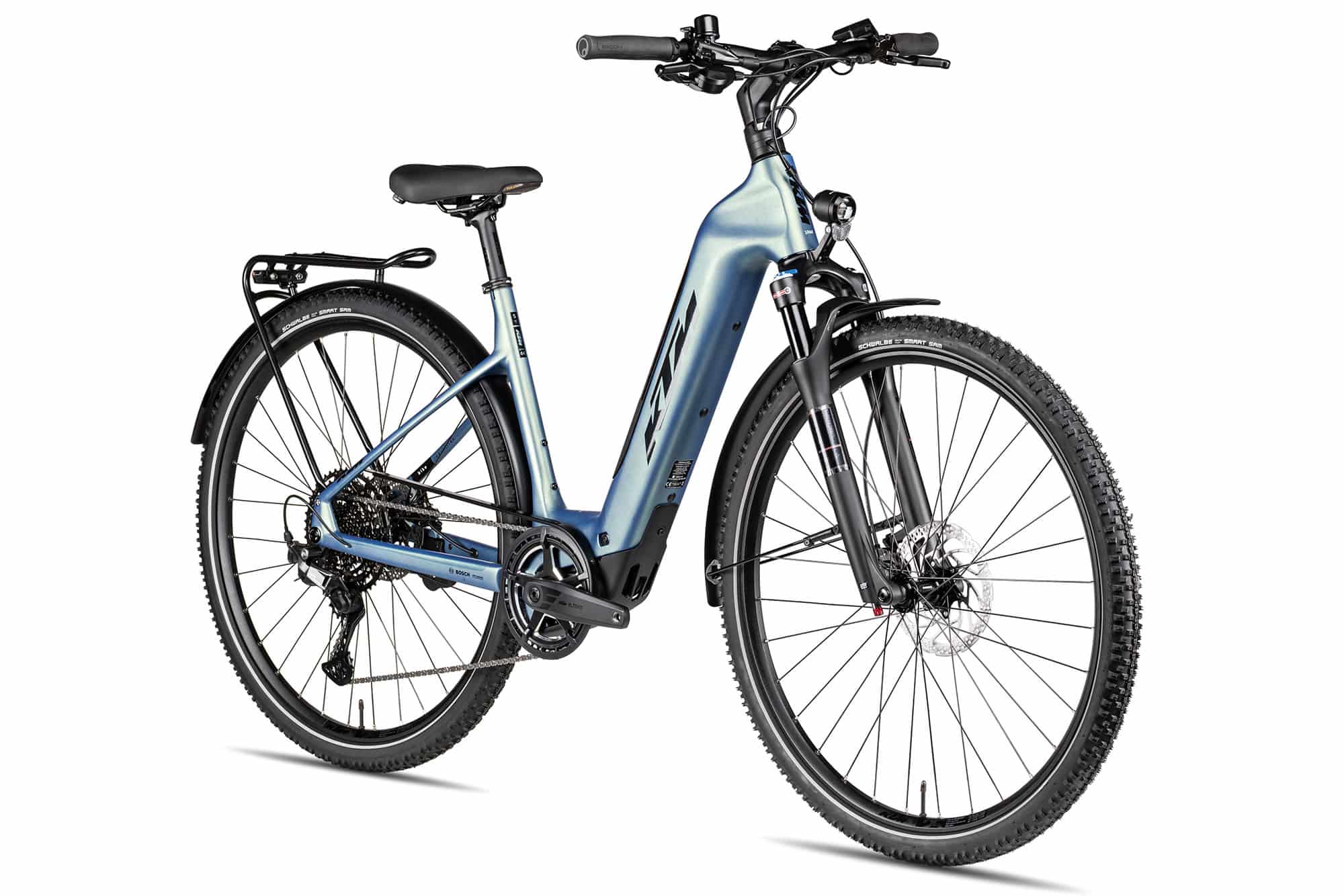 Leichtigkeit trifft Leistung: Das KTM Macina Magic SX Carbon., Für ein Plus an Alltagstauglichkeit sorgen der besonders helle 150 Lux Scheinwerfer und der Racktime-Systemgepäckträger, auf dem du Tasche oder Korb in Sekundenschnelle befestigst., Komfort auf längeren Strecken oder holprigen Wegen bietet dir die 63 mm Luft-Federgabel und haptisch angenehmen Ergon Griffe., Angetrieben vom Bosch Performance Line SX Motor und einem 400 Wh Akku, bekommst du ein modernes, kraftvolles und dabei erstaunlich leichtes System., Zuverlässig, langlebig und perfekt abgestimmt., Mit der Shimano Cues U6000 10-Gang Schaltung und hydraulischen Scheibenbremsen genießt du präzise Technik vom Komponenten-Marktführer., Der hochwertige Kohlefaserrahmen des Macina Magic SX Carbon bringt das Gewicht auf ein sensationell niedriges Level von unter 20 Kilogramm und sorgt für ein agiles und sportliches Fahrgefühl., Ideal für alle, die ein leistungsstarkes E-Bike mit