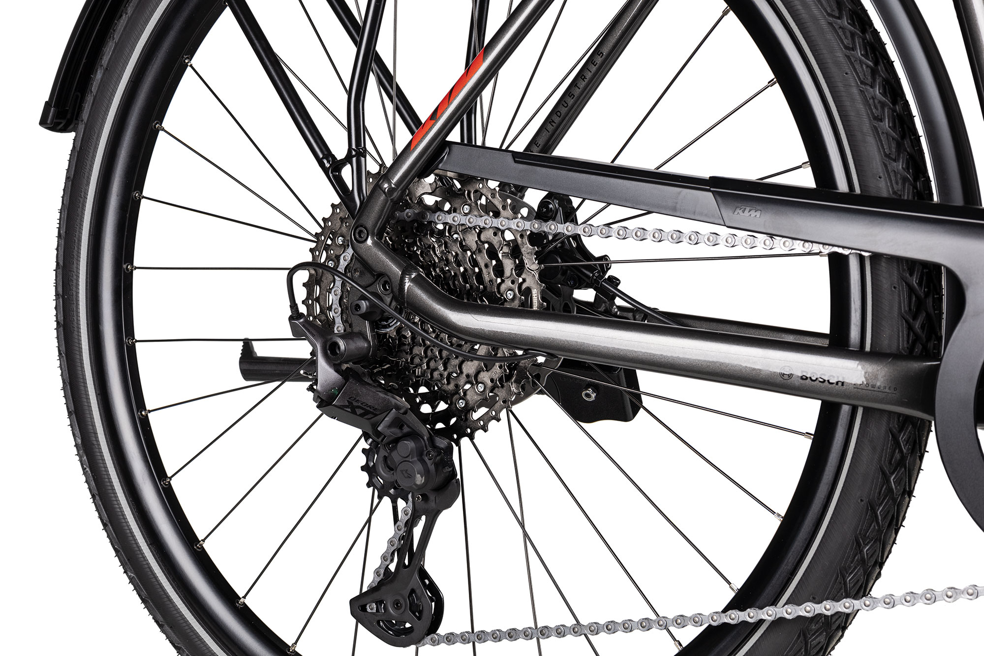 Ebenfalls von Shimano stammt die hydraulische 4-Kolben Scheibenbremsanlage., KTM hat den 85 Nm starken Bosch Performance Line CX Antrieb zusammen mit dem riesigen 750 Wh Akku besonders elegant integriert., Robust, kompakt und elegant am Vorbau untergebracht, überzeugt das Kiox 300 System mit Fernbedienbarkeit und Bluetooth-Vernetzung., Das 11-fach Schaltwerk stammt aus Shimanos hochwertiger XT Mountainbike-Gruppe und liefert dem Macina Sport 720 fein übersetzte Gänge, die per XT Schalthebel flüssig durchgeschaltet werden können., Dazu kommt am Macina Sport 720 der Kiox 300 Bordcomputer mit Farbdisplay zum Einsatz., Besondere Details wie die Busch & Müller Lichtanlage mit 150 Lux Scheinwerfer, die 63 mm SR Suntour NCX-D Luft-Federgabel mit Lockout oder die Ergon GP3 Griffe mit Barends, runden die hochwertige Ausstattung des KTM Macina Sport 720 Trekking-E-Bikes stimmig ab., Perfekt für ausgedehnte Touren und Radurlaube: Das KTM Macina