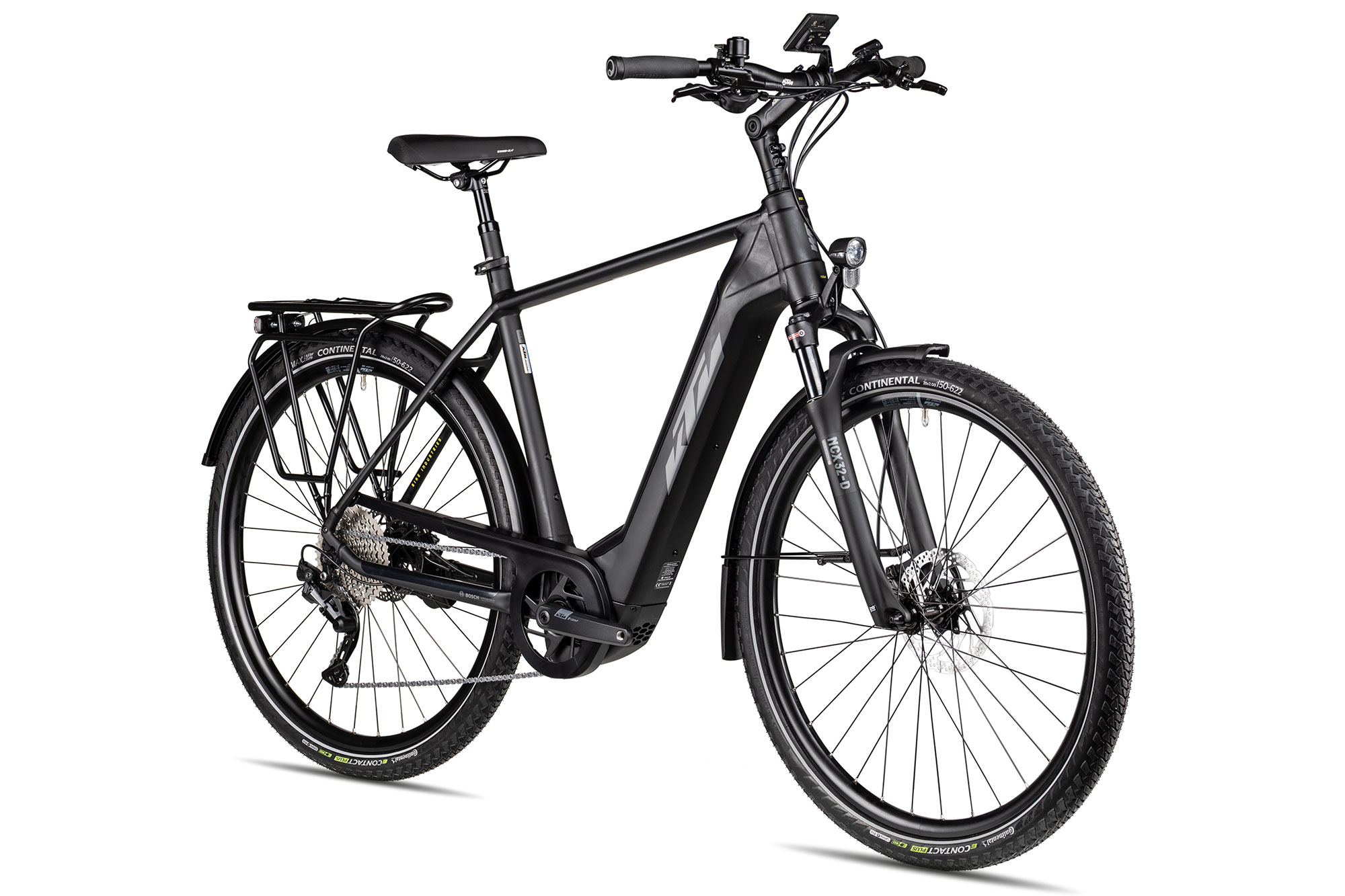 Ordentlich zupackend und gut dosierbar, verzögert sie dieses KTM Trekking-E-Bike auch bei höheren Geschwindigkeiten zuverlässig., Das Schaltwerk dieses KTM Trekking-E-Bikes stammt aus Shimanos wertiger Deore Gruppe und liefert dem Macina Tour CX 610, 10 fein übersetzte Gänge., Ebenfalls aus dem Hause Shimano stammt die hydraulische Scheibenbremsanlage., KTM hat hier den extrastarken Bosch Performance Line CX Motor, zusammen mit einem 625 Wh PowerTube Akku elegant im Unterrohr integriert., Dazu steigern die angenehmen Ergon Griffe und der gut verstellbare Vorbau deinen Reisekomfort auf längeren Fahrten., Abgerundet wird das kraftvolle Bosch E-Antriebssystem mit dem smarten Intuvia 100 Bordcomputer., Für den Federkomfort hat KTM seinem Trekking-E-Bike eine hauseigene gefederte Sattelstütze, sowie eine 63 mm SR Suntour Federgabel mit lockout spendiert., Eine klasse Kombination für lange Strecken mit anspruchsvollen Steigungen, Ideal für