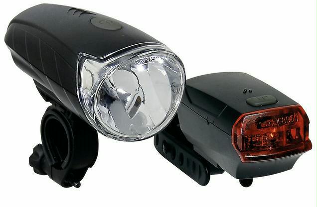 LED-Batterielampenset 40 Lux vorne+hinten zusammen mit 8 Batterien und Schnellbefestigungshalter in einer kompakten Set-Verpackung. Mit StVZO Zulassung.