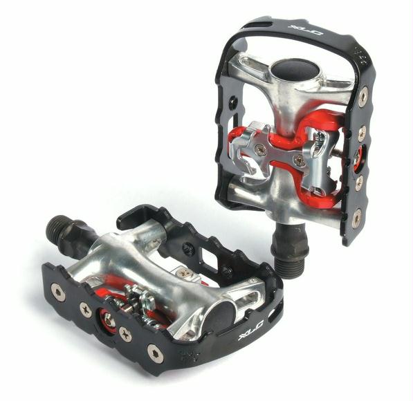 Duo-Pedal für normale Sportschuhe und für Clipless-Schuhe. Gehärtete Cr-Mo-Pedalachse. In Verbindung mit den mitgelieferten Platten Shimano SPD-kompatibel
