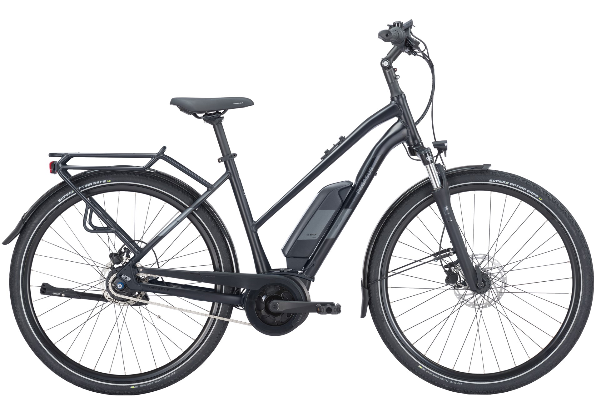 PEGASUS Solero E8R Plus 400 Wh 2024 komfortables City-E-Bike mit Rücktritt Das PEGASUS Solero E8R Plus 400 Wh 2024 ist ein vielseitiges City-E-Bike für Alltag, Pendelstrecke und entspannte Touren. Der leichte Aluminiumrahmen bietet eine komfortable, leicht aufrechte Sitzposition und viel Übersicht im Straßenverkehr ideal für Stadtfahrten und Radwege. Der Bosch Active Line Plus Motor mit 50 Nm unterstützt dich harmonisch bis 25 km/h, der 400-Wh-Akku liefert solide Reichweite für tägliche Wege. Über das Bosch Intuvia Display behältst du Geschwindigkeit, Unterstützungsstufe und Restreichweite jederzeit im Blick. Die bewährte Shimano Nexus 8-Gang Nabenschaltung mit Rücktrittbremse schaltet zuverlässig und nahezu wartungsfrei perfekt für Stop-and-go im Stadtverkehr. Hydraulische Tektro-Scheibenbremsen, die SR SUNTOUR NEX-E25 Federgabel und pannensichere SUPERO Optima Safe 50-622 Reifen sorgen für Komfort und Sicherheit auf Kopfsteinpflaster und schlechten Wegen. Das zulässige Gesamtgewicht beträgt 135 kg. Highlights auf einen Blick: Bosch Active Line Plus Motor, 50 Nm 400-Wh-Akku & Bosch Intuvia Display Shimano Nexus 8-Gang Nabenschaltung mit Rücktritt Hydraulische Tektro-Scheibenbremsen & SR SUNTOUR NEX-E25 Federgabel Pannensichere SUPERO Optima Safe Reifen, zulässiges Gesamtgewicht 135 kg Ob Stadtbummel, Arbeitsweg oder Feierabendtour das PEGASUS Solero E8R Plus 400 Wh 2024 bringt dich komfortabel, sicher und mit viel Fahrspaß ans Ziel. – PEGASUS Solero E8R Plus 400 Wh 2024 komfortables City-E-Bike mit Rücktritt Das PEGASUS Solero E8R Plus 400 Wh 2024 ist ein vielseitiges City-E-Bike für Alltag, Pendelstrecke und entspannte Touren. Der leichte Aluminiumrahmen bietet eine komfortable, leicht aufrechte Sitzposition und viel Übersicht im Straßenverkehr ideal für Stadtfahrten und Radwege. Der Bosch Active Line Plus Motor mit 50 Nm unterstützt dich harmonisch bis 25 km/h, der 400-Wh-Akku liefert solide Reichweite für tägliche Wege. Über das Bosch Intuvia Display behältst du Geschwindigkeit, Unterstützungsstufe und Restreichweite jederzeit im Blick. Die bewährte Shimano Nexus 8-Gang Nabenschaltung mit Rücktrittbremse schaltet zuverlässig und nahezu wartungsfrei perfekt für Stop-and-go im Stadtverkehr. Hydraulische Tektro-Scheibenbremsen, die SR SUNTOUR NEX-E25 Federgabel und pannensichere SUPERO Optima Safe 50-622 Reifen sorgen für Komfort und Sicherheit auf Kopfsteinpflaster und schlechten Wegen. Das zulässige Gesamtgewicht beträgt 135 kg. Highlights auf einen Blick: Bosch Active Line Plus Motor, 50 Nm 400-Wh-Akku & Bosch Intuvia Display Shimano Nexus 8-Gang Nabenschaltung mit Rücktritt Hydraulische Tektro-Scheibenbremsen & SR SUNTOUR NEX-E25 Federgabel Pannensichere SUPERO Optima Safe Reifen, zulässiges Gesamtgewicht 135 kg Ob Stadtbummel, Arbeitsweg oder Feierabendtour das PEGASUS Solero E8R Plus 400 Wh 2024 bringt dich komfortabel, sicher und mit viel Fahrspaß ans Ziel. – Display Bosch Intuvia Motor Bosch Active Line Plus Motor-Typ Mittelmotor Motor-Unterstützung bis 25 km/h Motor-Leistung 50 Nm Motor-Spannung 36 V Akku 11 Ah Systemleistung 400 Wh Reichweite maximal siehe Bosch Reichweitenrechner Akku-Ladezeit 100% ca. 6,5 Std. Akku-Typ Lithium Ionen Radgröße 28 Zoll Rahmenform Trapez Farbe black matt Rahmen Aluminium Gabel SR SUNTOUR NEX-E25 Steuersatz FSA no.11N Bremsen TEKTRO HD-T280 Hydraulische Scheibenbremse Gänge 8 Gang Nabenschaltung mit Rücktritt Hinterradnabe SHIMANO Nexus inter 8 internal hub gear with coaster brake Schaltwerk SHIMANO Nexus inter 8 internal hub gear with coaster brake Schalthebel SHIMANO Nexus SL-C6001 Revoshift Kurbelgarnitur FSA Bereifung SUPERO Optima Safe Anti-Puncture 50-622 Naben SHIMANO Nexus inter 8 internal hub gear with coaster brake Felgen DDM-2 Scheinwerfer FUXON FS-30 EB, 30 Lux LED Rücklicht FUXON R-232 EB, mit COB Technologie Lenker MTB riserbar Vorbau A-Head Vorbau verstellbar Sattel SELLE ROYAL Essenza Plus Sattelstütze Aluminium Pedale Trekking Pedale mit Kunststoffkörper mit 2K Kunststoffkäfig Gepäckträger MonkeyLoad angeschweißt, in Rahmenfarbe Schutzbleche SKS PET Kettenschutz HORN Catena 18 Sonstiges zulässiges Gesamtgewicht 135 kg Gewicht ca. 27,4 kg