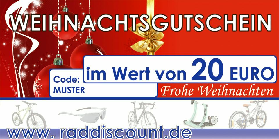 Weihnachts-Gutscheine von Raddiscount sind das perfekte Geschenk zu Weihnachten. Sie erhalten einen individuellen Weihnachts-Gutschein an Ihre Emailadresse im PDF-Format (Acrobat Reader) zugeschickt. Drucken Sie mit Ihrem Drucker den Gutschein in Far