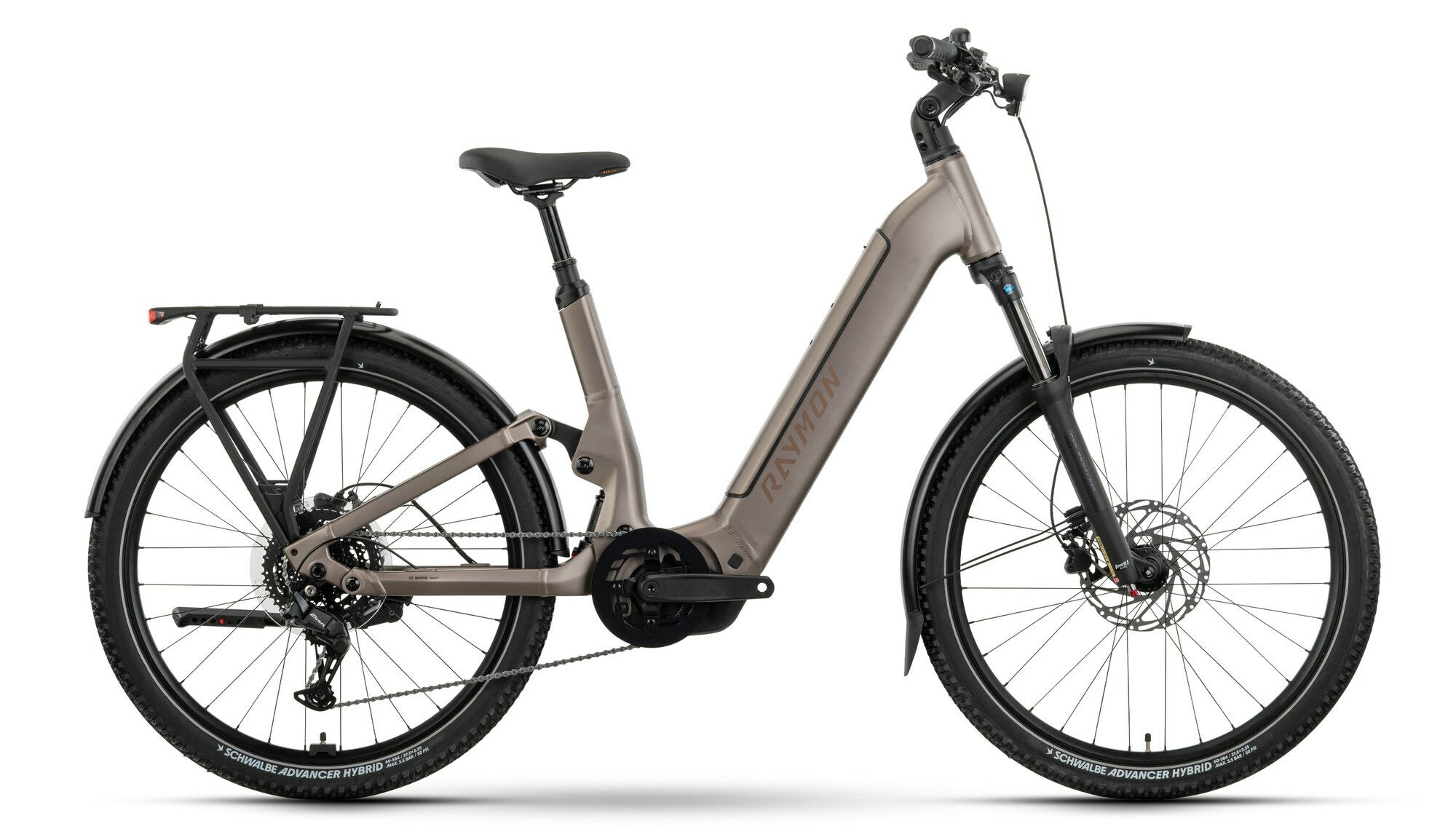 Bremssystem: Scheibenbremse, hydraulisch | Versandkosten: 2 | Laufradgröße hinten: 27,5 | Motorhersteller: Bosch | Rücktritt/Freilauf: Freilauf | Rahmenmaterial: Aluminium | Maximales Gesamtgewicht (kg): 150 | Laufradgröße vorne : 27,5 | Motorposition: Mittelmotor | Federung: luftgefedert | Schaltungstyp: Kettenschaltung | Akkuposition: intube | Rahmengröße: S | Bremsscheibe vorne (mm): 203 | Federweg (mm): 120 | Bremsscheibe hinten (mm): 180 | Gabelhersteller: SR Suntour | Schaltungshersteller: Shimano | Rahmenform: Wave | Ganganzahl: 8 | Akku-Kapazität (Wh): 600 | Pedale: Raymon, Aluminium | Sattelstütze: Raymon, 34,9 mm, Dropper Post | Motorleistung (Nm): 75 | Vorbau: Raymon 31.8, Ahead, adjustable | Griffe: Raymon Ergo, lock on | Lenker: Raymon Riser 31,8 mm, Sweep: 15 °, Rise: 30 mm | Bremse: Tektro HD-M3120 | Steuersatz: FSA CR, ICR | Scheinwerfer: Litemove RLX-100, 100 lx | Farbe: Bronze | Kette: KMC e8S | Motor: Bosch Performance Line, 250/600 W, 75 Nm | Akku: Bosch PowerTube, 600 Wh, 36 V | Display: Bosch Purion 200, Bluetooth | Laufradsatz: Raymon VR24/DT210, 15×110/12×148 mm | Schaltung: Shimano Essa, RD-U2000, 8-S | Gepäckträger: Raymon, MIK, 25 kg | Rückleuchte: Litemove TX3 Raymon | Gabel: SR Suntour XCR34X Boost 2CR | Reifen: Schwalbe Advancer Hybrid, Reflex, 60-584, 27.5×2.35 | Dämpfer: SR Suntour EdgeX R, air, 190×45 mm | Sattel: Selle Royal Explora Plus | Ständer: Ursus INTEGRALE ANS, IC44, adjustable | Sattelklemmung: Tavano, 39,1, hex screw | Hersteller-Farbe: taupegrey | Kassette: Shimano CS-HG300-8, 11-45T | Schutzbleche: Curana Apollo | Gewicht ca. (kg): 29.7 | Schalthebel: Shimano SL-M315, Rapidfire Plus