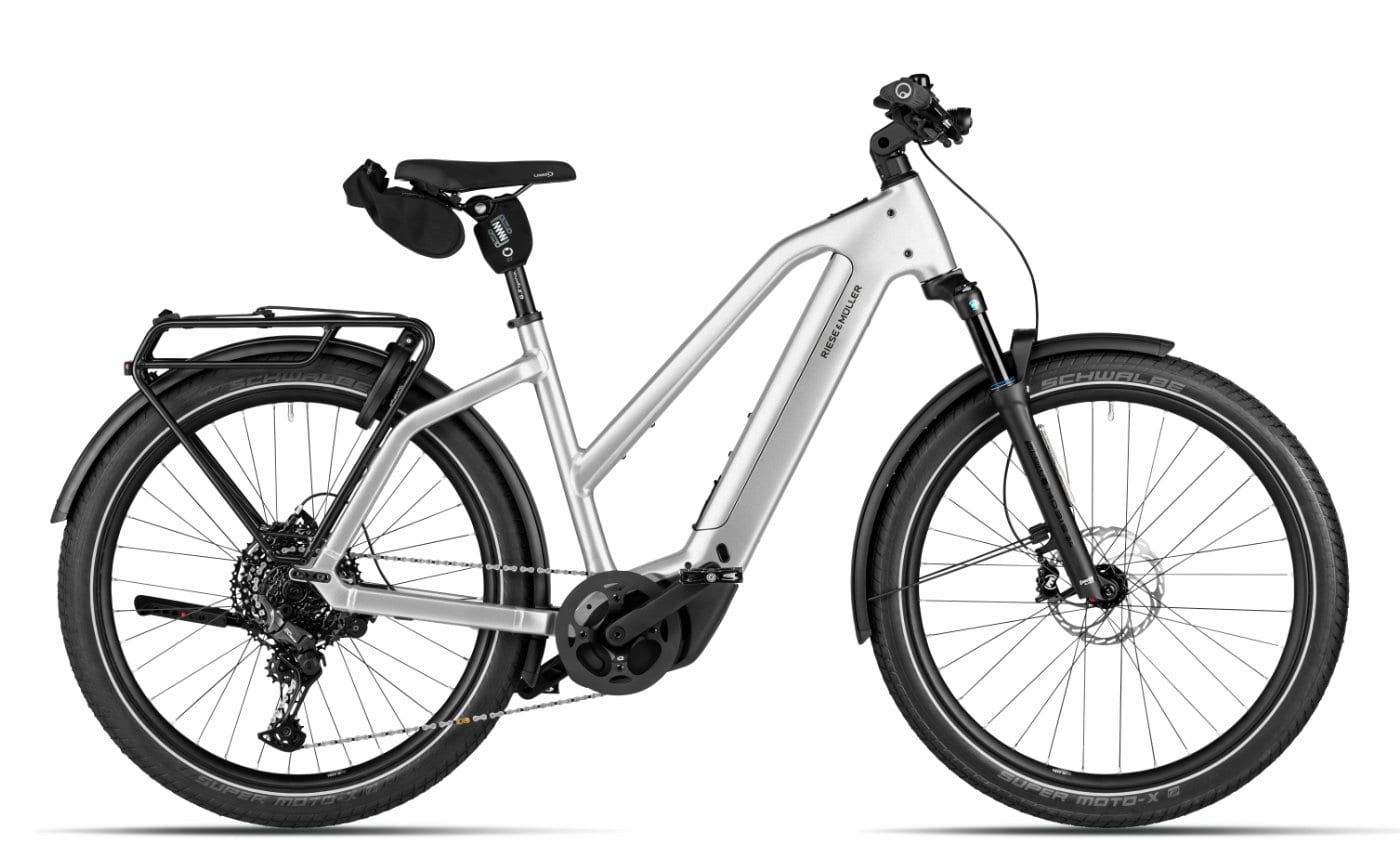 Riese & Müller Charger5 Mixte Touring – magnesium Das Riese & Müller Charger5 Mixte Touring in magnesium verbindet Wendigkeit eines Mountainbikes mit dem Komfort eines Tourenrades. Ausgestattet mit Bosch Performance Line CX Motor und 800 Wh Akku unterstützt es zuverlässig auf längeren Pendelstrecken, Ausflügen oder Touren. Der steife Rahmen in Kombination mit gefederter Gabel und Sattelstütze sorgt für laufruhiges Fahrverhalten. Hochwertige Optik entsteht durch verschliffene Schweißnähte und das lackierte Aluminium-Akkucover in Rahmenfarbe. Motor: Bosch Performance Line CX, bis 25 km/h Akku: Bosch PowerTube 800 Wh, horizontal Gabel: SR Suntour Mobie 34, 100 mm Federweg, Boost Schaltung: Shimano XT 11-Gang Linkglide Bremse: Magura MT4 hydraulische Scheibenbremsen Reifen: Schwalbe Super Moto-X 27,5 x 2,40 Sattel: Selle Royal Essenza Moderate Mit einem Gewicht von 31,2 kg und einem zulässigen Gesamtgewicht von 160 kg bietet dieses E-Bike Stabilität, Sicherheit und Fahrspaß für jede Tour oder den Alltag.