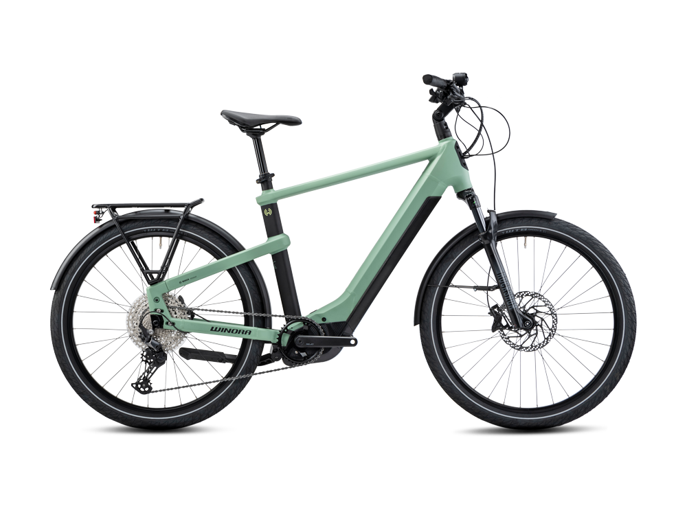 Winora Yakun 12 High Trekking E-Bike (27,5″ | 750Wh | defender)Du suchst ein zuverlässiges und robustes eTrekkingbike, das in der Stadt und im Gelände zu Hause ist? Dann ist das neue WINORA Yakun 12 genau das Richtige für dich! Unserem Premium E-SUV mit einem zulässigen Gesamtgewicht von bis zu 150 kg ist keine Aufgabe zu schwer: Der leichte und ultrastarke Bosch Performance CX Motor mit bis zu 85Nm Drehmoment treibt dich kraftvoll an, während der 750Wh Akku genügend Reserven bietet, wenn du mal etwas länger unterwegs bist. Hochwertige Shimano Deore Schalt- und Bremskomponenten sowie eine RockShox Luftfedergabel sorgen für Komfort und Sicherheit auf Tour. Was uns ausmacht, ist irgendwo da draußen. Und mit jedem Pedaltritt kommen wir uns selbst ein Stück näher. Wir sitzen fest im Sattel und erkennen unsere Stärken. Auf unseren Touren entdecken wir die Schönheit der Natur. Wir fahren in die Berge und geben alles. Wir lassen uns mit dem Strom treiben und genießen die Ausblicke, die wir uns eigenständig erfahren. Wir erobern die Stadt und kommen dabei einfach immer gut an. Wir wachsen mit unseren Streifzügen und lassen den Alltag hinter uns. All das gehört zu den schillernden Facetten eines Lebensgefühls, das erst mit den richtigen Fahrrädern komplett wird.