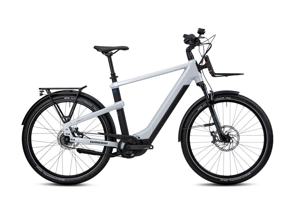 Winora Yakun R5 Pro High Trekking E-Bike (27,5″ | 750Wh | eisweiß) Das WINORA Yakun R5 Pro ist das perfekte Trekking eBike für Abenteurer, denn es vereint SUV-Feeling mit Komfort und Effizienz. Der kraftvolle Bosch Performance CX Smart System Motor mit einem Drehmoment von bis zu 85 Nm gibt dir ordentlichen Schub, wenn du mit schweren Einkäufen, Kinderanhänger oder Campingausrüstung unterwegs bist. Das zulässige Gesamtgewicht von bis zu 150 kg, ein extragroßer 750 Wh Akku, großvolumige 27″ Reifen sowie ein serienmäßiger Frontgepäckträger rüsten dich bestens für jedes Vorhaben auf zwei Rädern. Top Komponenten wie der wartungsarme Riemenantrieb, eine pflegeleichte Shimano Nabenschaltung sowie Shimano XT Bremskomponenten und eine RockShox Luftfedergabel sorgen dafür, dass jede Ausfahrt zum Erlebnis wird – egal ob du durch die Stadt oder ins Grüne fährst. Das Yakun R5 Pro ist als Unisex Modell und als Tiefeinsteiger erhältlich. Was uns ausmacht, ist irgendwo da draußen. Und mit jedem Pedaltritt kommen wir uns selbst ein Stück näher. Wir sitzen fest im Sattel und erkennen unsere Stärken. Auf unseren Touren entdecken wir die Schönheit der Natur. Wir fahren in die Berge und geben alles. Wir lassen uns mit dem Strom treiben und genießen die Ausblicke, die wir uns eigenständig erfahren. Wir erobern die Stadt und kommen dabei einfach immer gut an. Wir wachsen mit unseren Streifzügen und lassen den Alltag hinter uns. All das gehört zu den schillernden Facetten eines Lebensgefühls, das erst mit den richtigen Fahrrädern komplett wird. Welche Größe passt mir?Winora empfiehlt für das Yakun R5 Pro die folgenden Rahmengrößen je nach Körpergröße: 160-167cm: 45cm 168-177cm: 50cm 178-187cm: 55cm 188-197cm: 60cm