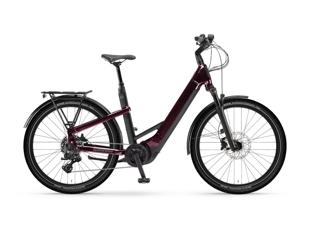 Winora Yakun X10E Wave Trekking E-Bike (27,5″ | 625Wh | dunkelrot)Mit dem neuen WINORA Yakun X10E kommt SUV Feeling auf, denn dieses robuste eTrekkingbike macht auf der Straße genauso viel Spaß wie auf Wald- und Schotterwegen. Der leistungsstarke Bosch Performance CX Smart System Motor unterstützt dich effizient und ausdauernd – vor allem dann, wenn du mit Gepäck unterwegs bist, das du auf dem serienmäßigen Gepäckträger hinten sowie auf dem optionalen Frontgepäckträger verstauen kannst. Mit der zuverlässigen 10-Gang Schaltung von Shimano findest du immer die perfekte Übersetzung und die hydraulischen Shimano Scheibenbremsen sorgen dafür, dass du dein eBike in jeder Situation unter Kontrolle hast. Die StVZO-konforme Ausstattung rundet das Yakun X10E ab und macht es zu einem vielseitigen Einsteiger Trekking eBike, das zu einem fairen Preis zu haben ist. Es ist in zwei Rahmenvarianten als Unisex Modell und als bequemer Tiefeinsteiger erhältlich.Was uns ausmacht, ist irgendwo da draußen. Und mit jedem Pedaltritt kommen wir uns selbst ein Stück näher. Wir sitzen fest im Sattel und erkennen unsere Stärken. Auf unseren Touren entdecken wir die Schönheit der Natur. Wir fahren in die Berge und geben alles. Wir lassen uns mit dem Strom treiben und genießen die Ausblicke, die wir uns eigenständig erfahren. Wir erobern die Stadt und kommen dabei einfach immer gut an. Wir wachsen mit unseren Streifzügen und lassen den Alltag hinter uns. All das gehört zu den schillernden Facetten eines Lebensgefühls, das erst mit den richtigen Fahrrädern komplett wird.